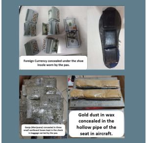 दिल्लीच्या वसंत विहार येथील रहिवासी असलेल्या एका भारतीयाला ताब्यात घेण्यात आले आहे. त्याच्या चेक-इन बॅगेजमध्ये प्लास्टिकच्या 14 एकसमान पारदर्शक पाकिटात गांजासदृश (मारिजुआना) हिरवट रंगाचा पदार्थ तीन लहान कार्डबोर्ड बॉक्समध्ये लपवून ठेवलेला आढळून आला. हा पदार्थाचे वजन 4977 ग्रॅम होते. दुबईहून 2, जेद्दाहहून, शारजाह, कोलकाता आणि अहमदाबादमधून आलेल्या प्रत्येकी एक अशा सहा भारतीय नागरिकांकडे 24 कॅरट सोन्याची धूळ, 24 कॅरट गोल्ड बार आणि 24 कॅरट सोन्याची तार रोडियम आढळून आली. त्यांचे एकूण वजन 7160 ग्रॅम होते. वायरमधील सामानाभोवती, एलईडी ड्रायव्हर्सच्या प्लास्टिक केसेसमध्ये आणि शरीरात ते लपवून ठेवले होते. या सहा जणांना अटक करण्यात आली आहे.